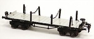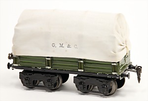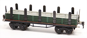 Spur 1, 4-achsiger Hochbord-Wagen, mit 2 seitl. Türen zum Öffnen, auf 2 Spur 0 Drehgestellen, sonst guter Zust.