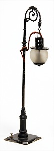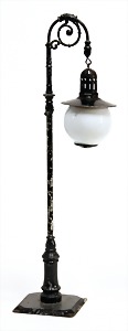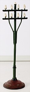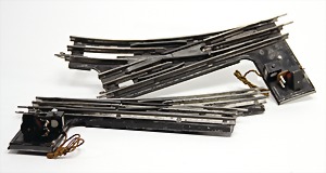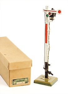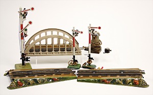 Konv. Spur 0, Läutewerk 13596, 2 Signale 12337-0, 1 Doppelflügel-Signal, altes Märklin-Zeichen, stärker bespielt, Lötstellen lose, 1 Bogenbrücke mit Auffahrteilen, bespielt gut