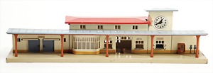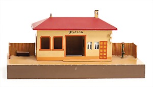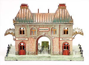 Bahnhof, passend zu Spur 0, mit Uhr, Uhr mit Funktion, Bodenplatte 56,5x13 cm, H: 16 cm, leicht bespielt, kl. Lackfehler