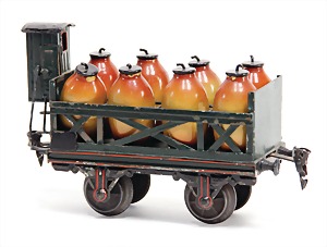 Spur 1, Güterwagen, grün, mit 8 Säurefässern, mit Verschluss, leicht bespielt, altersbed. Lackfehler, guter Zust.