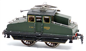 Spur 1, E-Lok V1021, Freihandschalter, grün, Uhrwerk intakt, leicht bespielt gut mit ein wenig Krakelee-Bildung im Dach