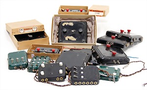 Gr. Konv. 30-tlg., Verteiler-Platten, Schalter, Kleinteile für Märklin Spur 0, darunter 187222, einige Teile im Orig.-Kart., meist guter Zust., bitte besichtigen