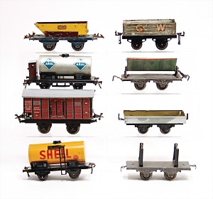 8-tlg., Spur 0, Güterwagen, Fleischmann, Bing, u.a., darunter 1 gedeckter Güterwagen mit Schlusslicht, 2 Tankwagen, bespielt- stärker bespielt