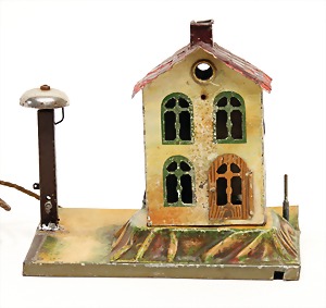 Uralt, Bahnwärter-Häuschen, Blech handlackiert, 19,5 cm, bespielt, Lackfehler, Läutewerk dazu gebaut, Kleinteile fehlen