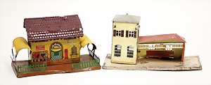 Bahnhof mit Bahnhofs-Überdachung, Blech lithogr., passend zu Spur 0, 18 cm, 1 Bahnhof wohl Kibri, Grundplatte 35x15,5 cm, stärker bespielt, Lackfehler, teilw. verbogen, Kleinteile fehlen