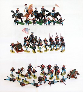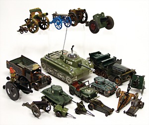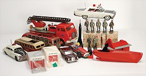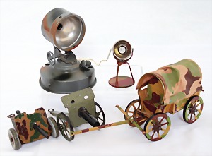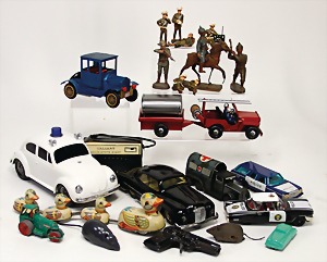 Konv. 20-tlg., darunter Elastolin Figuren, 1. Weltkrieg, Soldaten, Masse-Figuren, versch. Fahrzeuge, Blech, darunter 1 Krankenwagen, 2 Polizei-Autos, teilw. restauriert, guter Zust., dazu 1 Radio, made in Japan