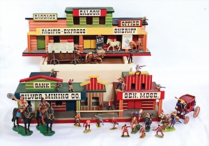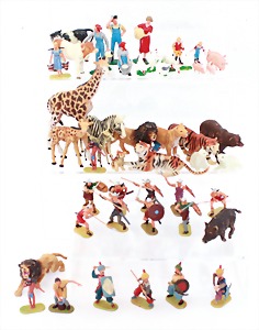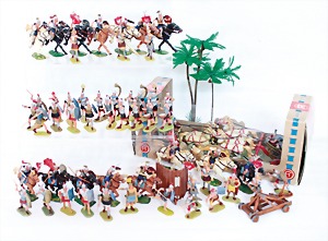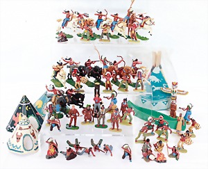 Konv. Indianer-Figuren, kl. Serie, 4 cm, kämpfend und zu Pferd, dazu einige Wigwams, 2 Kanus, Totem-Pfahl, und Figuren: Winnetou, Old Shatterhand, Sam Hawkens, schönes Konv., bitte besichtigen
