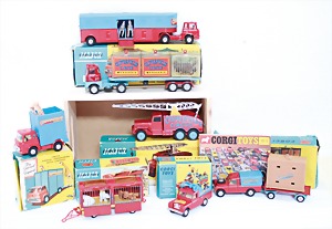 7-Tlg., Chipperfields-Circus, darunter Elefanten-Wagen, Pferde- und Tier-Transporter, Anhänger, Tierrassen-Wagen, Clowns-Wagen, Circus-Kran, 1 Corgi Katalog 1971/72, mit Orig.-Kart., 2 Kart. etwas verschlissen, 1 Lasche fehlt