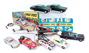 9 Fahrzeuge, darunter Batmobil mit Anhänger und Boot, James Bond-Wagen, Toyota, 1 Oldsmobile U.N.C.L.E., 2x The Green Hornet’s, 2x James Bond Wagen, Aston Martin, Fahrzeuge mit Funktion und Figuren, 2 Tour de France Wagen, 2 Corgi Kataloge 1966, bitte besichtigen