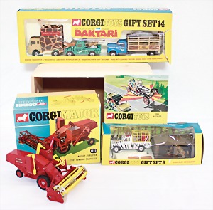 4 Fahrzeuge im Orig.-Kart., Daktariz, sehr guter Zust., am Kart. 1 Lasche eingerissen, 1 Safari-Fahrzeug mit Löwen-Käfig, im Orig.-Kart., 1 Mähdrescher, dazu 1 Katalog 1969