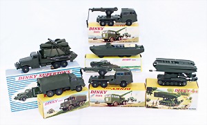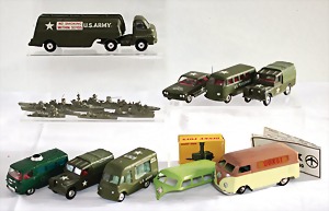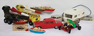 Konv. 11-tlg., 1 Rennwagen, 3 Boote, Blech lithogr., 2 LKW’s mit Raketen-Abschussrampe, 3 Fahrzeuge, 1 Wohnmobil (auseinander gebaut), Hersteller u.a.: Arnold, made in Germany, bespielter-guter Zust.
