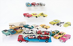 Konv. 23 Fahrzeuge, Rennwagen, PKW, Auto-Transporter, bespielt, dazu 1 Katalog von 1968