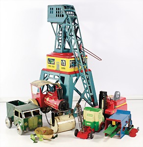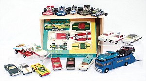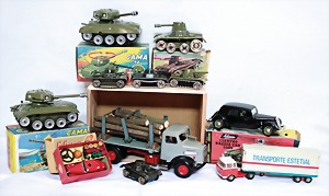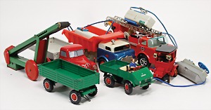 Konv. 13-tlg., 1 LKW mit Fernsteuerung, 1 Feuerwehr-Auto, 1 Förderband, 1 Hubschrauber, Hersteller u.a.: Gama, Tipp & Co., made in Western Germany, made in Japan, einige Artikel reparaturbedürftig, bespielter Zust.