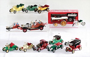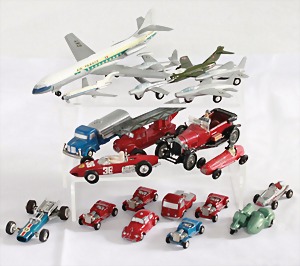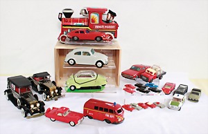 Konv. 8-tlg., Fahrzeuge, teilw. übermalt, teilw. restauriert, 1 Spielzeug-Kiste, 2 Fahrzeuge zum Zusammenbauen, versch. Hersteller, guter Zust.