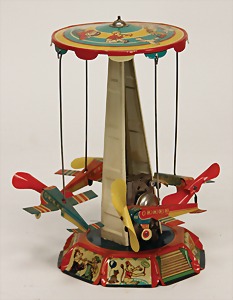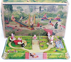 Spielplatz, Blech lithogr., 30x20 cm, Uhrwerk intakt, darauf 5 spielende Kinder mit Wippe, Schaukel und Karussell, im Orig.-Kart., Aufschrift: YH Artikel-Nr. 115, Kart. an einigen Stellen eingerissen