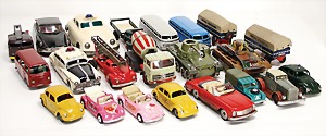 Konv. 22 Fahrzeuge und Anhänger, darunter 2 Panzer, Fahrzeuge wie Käfer, Cabrios, versch. Hersteller, u.a. Hayi, Gama, made in Japan, made in Thailand, bespielter-guter Zust.