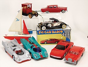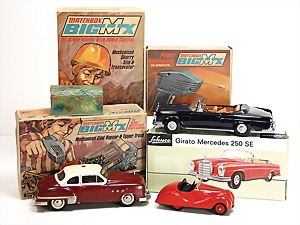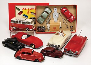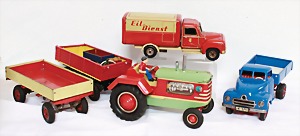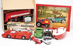 Konv. 9-tlg., 1 LKW zum Zusammenbauen, 1 Boot, 1 Traktor, 3 Fahrzeuge, 2 Rennwagen, 1 Autorennen-Brettspiel, Orig.-Kart., guter Zust., teilw. restaurierungsbedürftig, teilw. übermalt