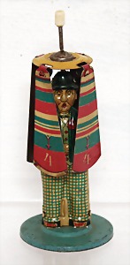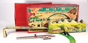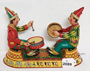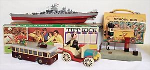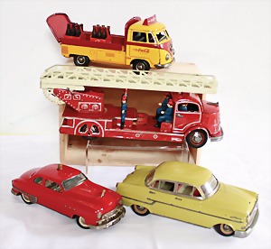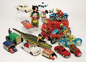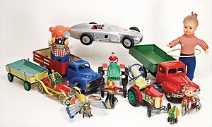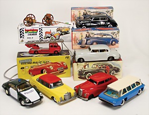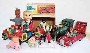 Konv. 10-tlg., 1 Dampflok, Blech lithogr., 1 Clown-Auto mit Fernsteuerung, Blech lithogr., bespielter Zust., diverse Puppen, 1 Kassenautomat, Blech lithogr., 1 Feuerwehr-Wagen, Blech lithogr., Hersteller u.a.: Arnold, teilw. Japanische Hersteller