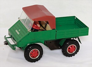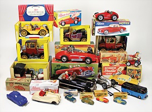 Konv. 10-tlg., 1 Sportwagen, 1 Traktor, Blech lithogr., 1 Hula Hoop Tänzerin, 2 Kipplader, teilw. neu lackiert, Hersteller u.a.: Gama, u.a.