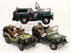 Konv. 3x Militär-Jeep, 2x Jeep ohne Frontscheibe, teilw. neu lackiert, mit Masse-Figuren, 1x guter Zust., Kleinteile fehlen, Sonderlackierung