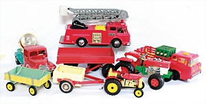 Konv. 8-tlg., 2 Traktoren mit Anhänger, 1 Feuerwehrwagen, 1 Kunststoff-LKW, teilw. bespielter Zust., Hersteller u.a. Marx, made in Hong-Kong