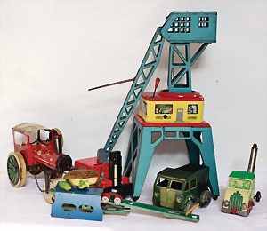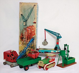 Konv. 6-tlg., 1 Kran, 1 LKW, 1 Traktor mit Walze, Blech lithogr., teilw. bespielter Zust., teilw. restaurierungsbedürftig, Hersteller u.a.: HRZ