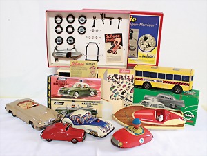 Konv. 9-tlg., 1 Bus, 1 Speed Boot, 1 Polizei-Auto, 1 Schuco Studio, im orig.-Kart., Hersteller u.a.: Schuco, MS, made in Western Germany, teilw. neu lackiert