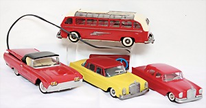 Konv. 4-tlg., 1 Bus, 3 Fahrzeuge, 1x mit Fernsteuerung, 1x Motorhaube fehlend, teilw. neu lackiert, sonst guter Zust.