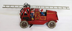 Feuerwehr-Wagen mit Leiter, Blech lithogr., 16 cm, Uhrwerk intakt, made in France, bespielter Zust.