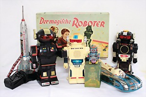 Konv. 6-tlg., 3 Roboter, 1 Rakete, 1 Brettspiel: Der magische Roboter, Orig.-Kart., Kunststoff/Blech, Hersteller u.a.: New Bright, bespielter-guter Zust.