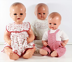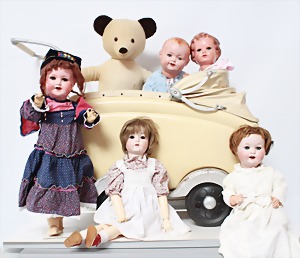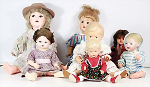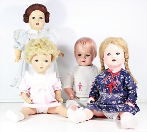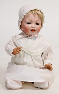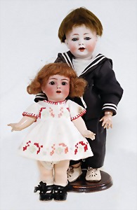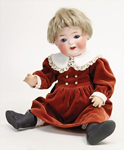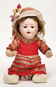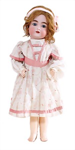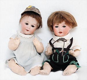 Biskuit-Porzellan-Puppen, 1x gem. DEP Nr. 9, blaue Schlafaugen, offener Mund, oben Zahnreihe, durchst. Ohren, Gliederkörper, Mohair-Perücke, 52 cm, dazu 1x Biskuit-Porzellan-Brustblattkopf, gem. DEP Germany Nr. 9, Simon & Halbig, braune Schlafaugen, offener Mund, oben Zahnreihe, durchst. Ohren, gegliederte Arme, Lederkörper, gegliederte Beine, 55 cm, dazu Biskuit-Porzellan Kurbelkopf, K&R, gem. 402, braune Schelmenaugen, offener Mund, oben Zahnreihe, durchst. Ohren, 43 cm, Gliederkörper 1x übermalt, dazu 1x Reproduktion, König & Wernicke, Nr. 1070, Biskuit-Porzellan-Kurbelkopf, blaue Glasaugen, offener Mund, oben 2 Zähne, Gliederkörper, 50 cm, alte Kleidung