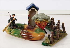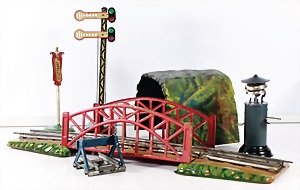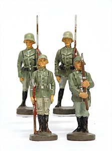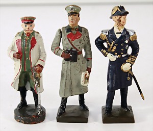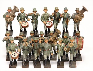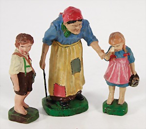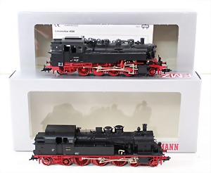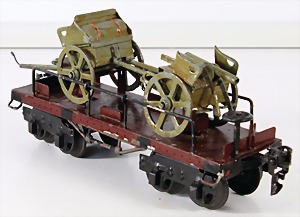 Konv. 3-tlg. Spur 0, Mitropa-Speisewagen, 2-achsig, Personenwagen, 1731, 2-achsig, grün, guter Zust., 1 Ziehwagen, altes Märklin-Zeichen, Blech handlackiert, 9,5 cm, teilw. farbl. ausgebessert (alte Übermalung), dazu 3 kl. Schweine, Ladegut, Masse