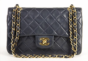 Handtasche, Modell: Flap Bag Timeless, blaues abgestepptes Lammleder, goldfarbenes CC-Logo mittig mit Drehverschluss, größenverstellbarer goldfarbener Ketten-Trageriemen mit verschlungenem Leder, 1 Seitentasche außen, 1 Fülltasche, blaues und bordeauxrotes Lammleder innen, 4 Seitentaschen innen, davon 1x mit Reißverschluss, H. ohne Trageketten: ca. 14,5 cm, B: ca. 23 cm, T: ca. 6,5 cm, guter Zust.