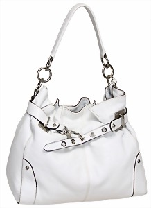 Damenhandtasche, Shopper, weißes Rindsleder, 1 Schultertrageriemen, silberfarbene Messingbeschläge, beiger Innenstoff, 1 Fülltasche, 3 Seitentaschen innen, davon 1x mit Reißverschluss, Abro-Leder-Emblem innen, 5 Füße, H: 25 cm, mit Henkel: 50 cm, B: 29 cm, T: 17 cm, leichte Gebrauchsspuren, sonst guter Zust.