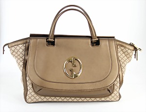 Handtasche, Guccissima Jacquard, beiger Stoff mit dunkelbraunen Ledereinsätzen, silberfarbene Beschläge, 2 geflochtene Leder-Schultertrageriemen, 1 Fülltasche mit Druckknopf-Verschluss, 1 Seitentasche mit Reißverschluss innen, Leder Emblem mit Gucci Prägung und ID-Nr., mit Staubbeutel, B: 37 cm, H. ohne Henkel: 25 cm, T: 13 cm, bis auf minim. Gebrauchsspuren in sehr gutem Zust.