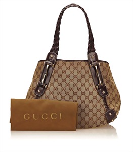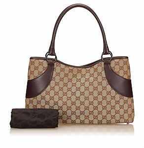 Handtasche, Guccissima Jacquard Tote Bag, 2 Leder-Trageriemen, mit silbernen Goldringen, Stoff mit Guccissima Monogramm, seitl. eingesetztes Leder, 4 silberfarbene Füße, Magnetknopf, dunkelbrauner Innenstoff, 1 Fülltasche, 1 Seitentasche mit Reißverschluss und Leder-Emblem, Gucci Prägung und ID Nr., mit Orig.-Staubbeutel, B: 35 cm, H: 23 cm, T: 5 cm, neuw. Zust.
