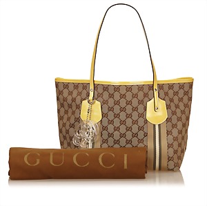 Handtasche, Jolie Tote, Stoff mit Guccissima Monogramm, mit gelbem Lackleder-Einsatz, 2 Schultertrageriemen, beigefarbener Innenstoff, 1 Fülltasche, 1 Seitentasche mit Reißverschluss, Lackleder-Emblem mit Gucci-Prägung und ID-Nr., mit Orig.-Staubbeutel, mit Kunststoff-Anhänger, B: 28 cm, H: 23 cm, T: 13 cm, neuw. Zust.