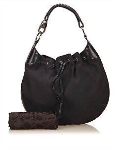 Handtasche, schwarz, seitl. schwarze Glattleder-Einsätze, silberfarbene Beschläge, Gucci-Gravur, Lederband zum Verschließen, 1 Fülltasche, 1 Seitentasche mit Reißverschluss, Leder-Emblem mit Gucci-Prägung und ID-Nr., B: 36 cm, H. ohne Trageriemen: 26 cm, neuw. Zust.