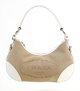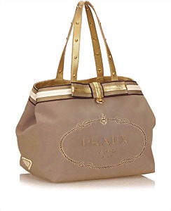 Handtasche, goldbrauner Stoff, mit Prada Schriftzug, seitl. mit Prada Emblem, 2 Tragehenkel, goldfarbenes Leder, mit Nieten, Magnetverschluss, 1 Fülltasche, goldfarbener Innenstoff, 1 Seitentasche mit Reißverschluss, B: 36 cm, H. ohne Trageriemen: 21 cm, T: 17 cm, 4 goldfarbene Füße, neuw. Zust.