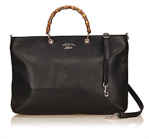 Handtasche Bamboo, schwarzes Nappaleder, goldfarbener made in Italy by Gucci-Schriftzug mittig, 2 Bamboo Holz-Tragehenkel, goldfarbene Beschläge, 1 abnehmbarer größenverstellbarer Schultertrageriemen, goldfarbener Reißverschluss mittig, 1 Fülltasche, schwarzer Innenstoff, 1 Seitentasche mit Reißverschluss, Leder-Emblem mit Gucci-Prägung und ID-Nr., B: 42 cm, H: 30 cm, T: 10 cm, neuw. Zust.