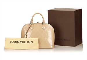 Handtasche, Alma Monogram Vernis PM, beige, 2 Tragehenkel, 1 Fülltasche, beiger Innenstoff, 2 Seitentaschen, Leder-Emblem, Data-Code: AA*1*5, mit orig.-Staubbeutel und Kart., mit Schloss und Schlüssel, Nr. 307, goldfarbener Reißverschluss, B: 31 cm, H: 25 cm, T: 12 cm, neuw. Zust.