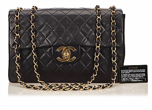 Handtasche, Flap-Bag Timeless, schwarzes abgestepptes Lammleder, goldfarbenes CC-Logo mittig, minim. Gebrauchsspuren, Drehverschluss, größenverstellbarer goldfarbener Ketten-Trageriemen mit verschlungenem Leder, 1 Seitentasche außen, 1 Fülltasche, bordeauxrotes Lammleder, 2 Seitentaschen, davon 1x mit Reißverschluss, ID-Stempel mit Nr., Chanel Authenticity-Card, sehr guter Zust.