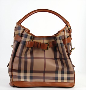 Umhängetasche, größenverstellbarer Leder-Trageriemen, Check-Muster, Boden mit Leder-Einsatz, 2 Fülltaschen, 1 Tasche mit Reißverschluss mittig, Ledergürtel, 1 Seitentasche mit Reißverschluss, H: 35 cm, B: 36 cm, T: 14 cm, leichte Verfärbungen an den Messing-Schnallen, sonst guter Zust.