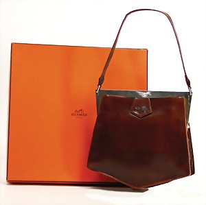 Frühe Handtasche, dunkelbraunes glattes Kalbsleder, Silber-Bügel, Bügel innen geprägt Hermès Paris, kurzer Leder-Tragehenkel, cognacfarbenes Leder innen, mit Hermès Stempel: 24F9ST.HOMURÈ.PAP, B: 19 cm, H. ohne Tragehenkel: 19 cm, ausgefallen, selten, in neuw. Hermès Kart.