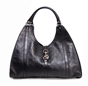 Handtasche, schwarzes Kalbsleder mit Guccissima Prägung, 2 Schultertrageriemen, silberne Beschläge, 1 Fülltasche, 1 Seitentasche mit Leder-Emblem und Gucci Prägung mit ID-Nr., H: 50 cm, B: 40 cm, T: 10 cm, sehr guter Zust.