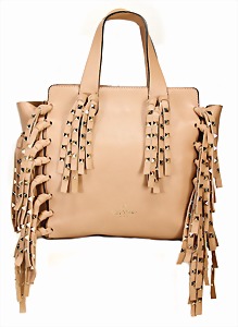 Handtasche, weiches genarbtes Kalbsleder, zartes altrosé, goldfarbener Valentino Aufdruck auf der Frontseite, Fransen mit Pyramiden-Nieten, Tragehenkel, 1 abnehmbarer Schultertrageriemen, 1 Fülltasche, 2 Seitentaschen mit Reißverschluss, ID-Nr: BL-K944VIZ2, B: 32 cm, H: 28 cm, T: 12 cm, neuw. Zust.