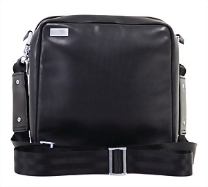 P2000, Umhängetasche, schwarzes Kalbsleder, 1 abnehmbarer größenverstellbarer Trageriemen mit mattierten silberfarbenen Beschlägen, 2 Fülltaschen, 1 eingesetztes Seitenfach innen, 1 Seitenfach mit Reißverschluss, 2 Karten-Lederfächer, 1 Außenfach mit Reißverschluss auf der Rückseite, H: 23 cm, B: 23 cm, T: 8 cm, bis auf minim. Stellen in sehr gutem Zust.