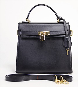 Handtasche, Made in Italy, schwarzes genarbtes Rindsleder, goldfarbene Beschläge, mit Schloss und Schlüssel, 1 kurzer Trageriemen, 1 Schultertrageriemen, Drehverschluss, 5 Füße, 1 Fülltasche, 1 Seitentasche mit Reißverschluss, H: 23 cm, B: 21 cm, T: 10 cm