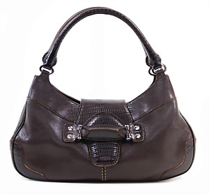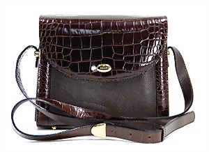 Handtasche, dunkelbraunes Leder mit Kroko-Optik, 2 Tragehenkel, Steck-Magnet-Verschluss, 3 Fülltaschen, davon 1x mit Reißverschluss, 1 Seitentasche innen mit Reißverschluss, H. ohne Henkel: ca. 17 cm, B: ca. 36 cm, T: 13 cm, sehr guter Zust.
