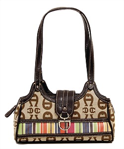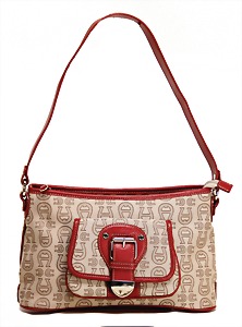Umhängetasche, Stoff mit Aigner Monogramm, bordeauxroter Rindsleder-Einsatz, Außentasche mit silberfarbener Schnalle, Magnetverschluss, 1 Fülltasche, 2 Seitentaschen, mittige Tasche mit Reißverschluss, B: 33 cm, H: 19 cm, T: 7 cm, 1 bordeauxroter Schultertrageriemen